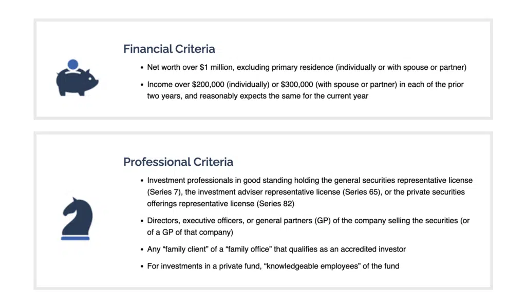Enterprise Entities | Entities, resembling trusts or organizations, with property exceeding $5 million can qualify. Moreover, entities by which all fairness house owners are accredited traders might also be thought of accredited. |