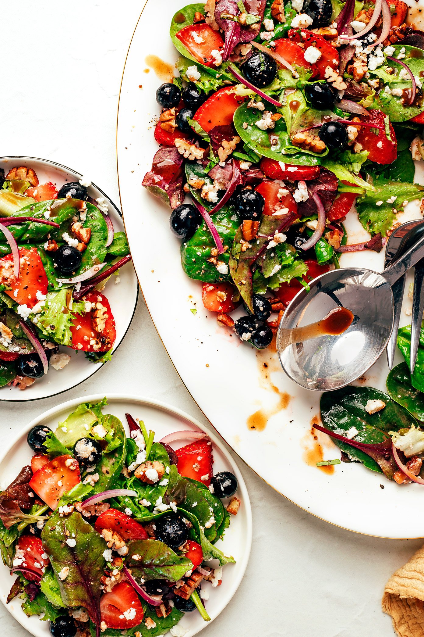 Weâve been having fun with serving this salad as a aspect dish currently, however you possibly can simply add your favourite protein (reminiscent of rooster, steak, salmon) or a scoop of grains to show it right into a heartier primary course. Nonetheless you serve it, itâs not possible to not love this salad. So seize some recent berries and letâs make a fast batch!