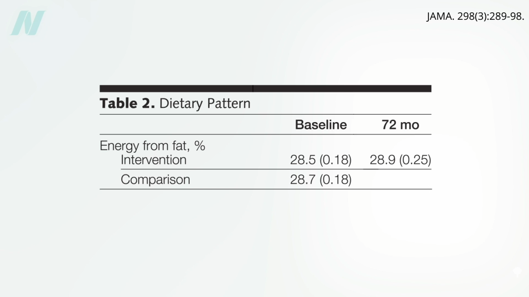 Any time there’s an sudden end result, you have to query whether or not the contributors truly adopted via with research directions. As an example, when you randomized folks to quit smoking they usually ended up with the identical lung most cancers charges as these within the group who weren’t instructed to give up, one doubtless clarification is that the group informed to quit smoking didn’t truly cease. Within the Ladies’s Wholesome Consuming and Dwelling Examine, each the dietary intervention group and the management group began out at about 30 p.c of energy from fats. Then, the food plan group was informed to decrease their fats consumption to fifteen to twenty p.c of energy. By the tip of the research, that they had the truth is gone from 28.5 p.c fats to twenty-eight.9 p.c fats, as you may see beneath and at 1:16 in my video The Meals That Can Downregulate a Metastatic Most cancers Gene. They didn’t even cut back their fats consumption. No marvel they didn’t expertise any breast most cancers profit.