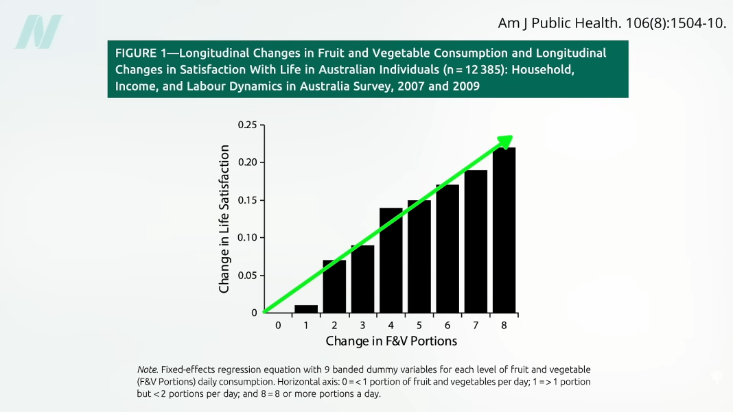 âElevated fruit and vegetable consumption was predictive of elevated happiness, life satisfaction, and well-being. They have been as much as 0.24 life-satisfaction factors (for a rise of 8 parts a day), which is equal in measurement to the psychological acquire of going from unemployment to employment.â (My Every day Dozen suggestion is for a minimum of 9 servings of fruits and veggies a day.)