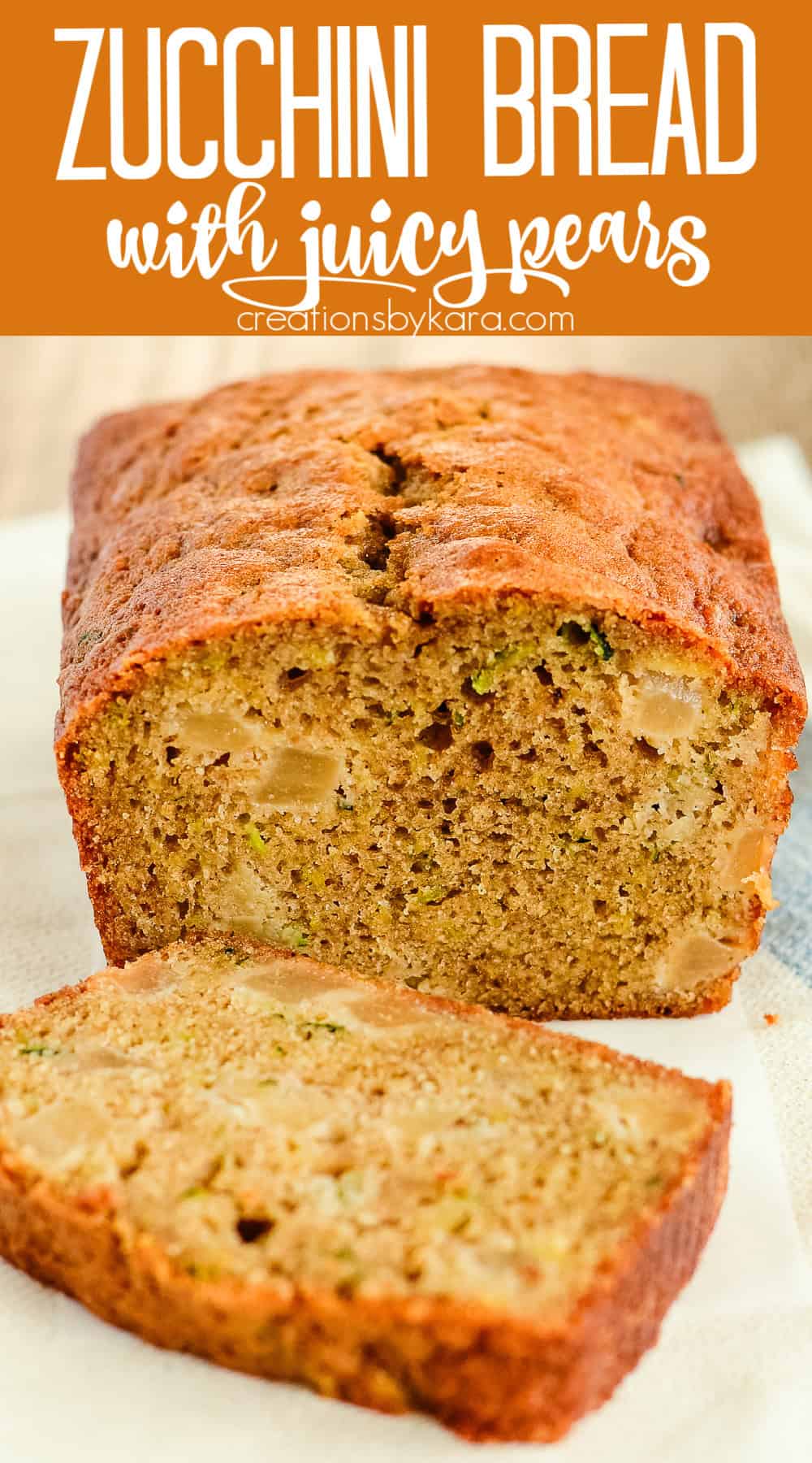 Have fun zucchini season with this completely spiced, moist pear zucchini bread. Each chunk is bursting with juicy pears!
