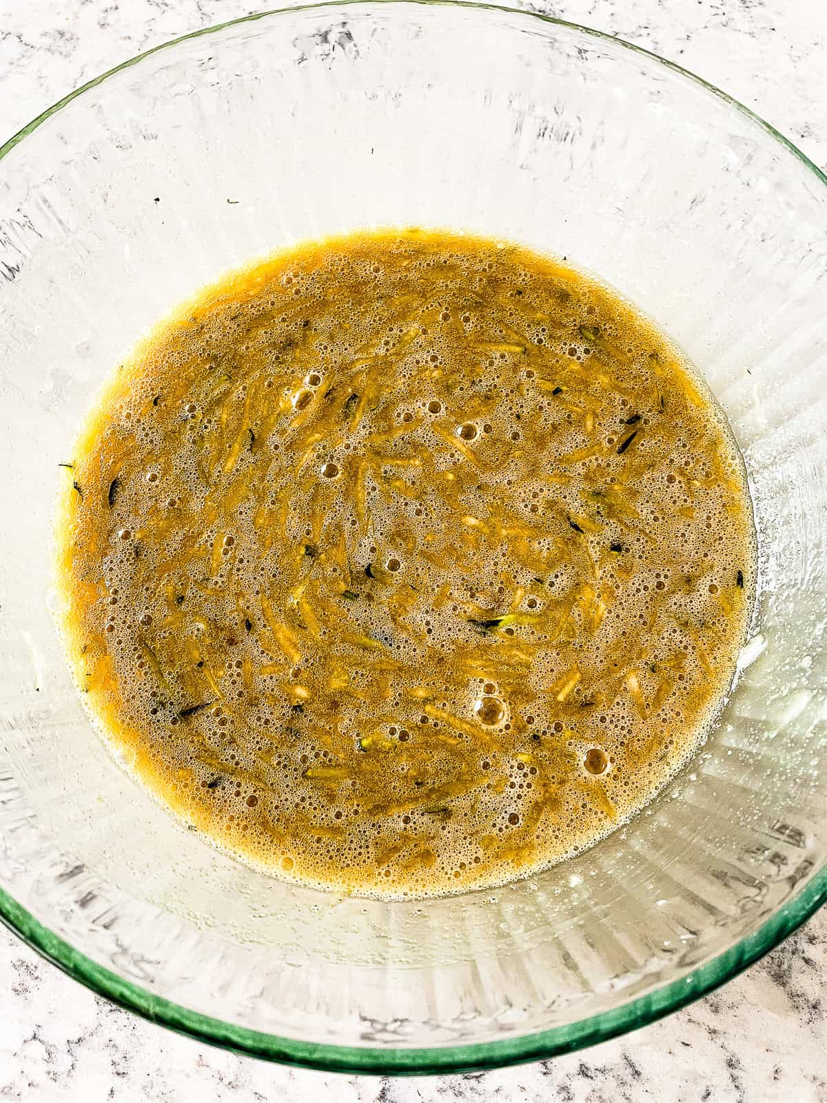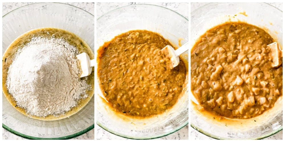 - Whisk the zucchini, sugars, eggs, oil, and vanilla in a big bowl.