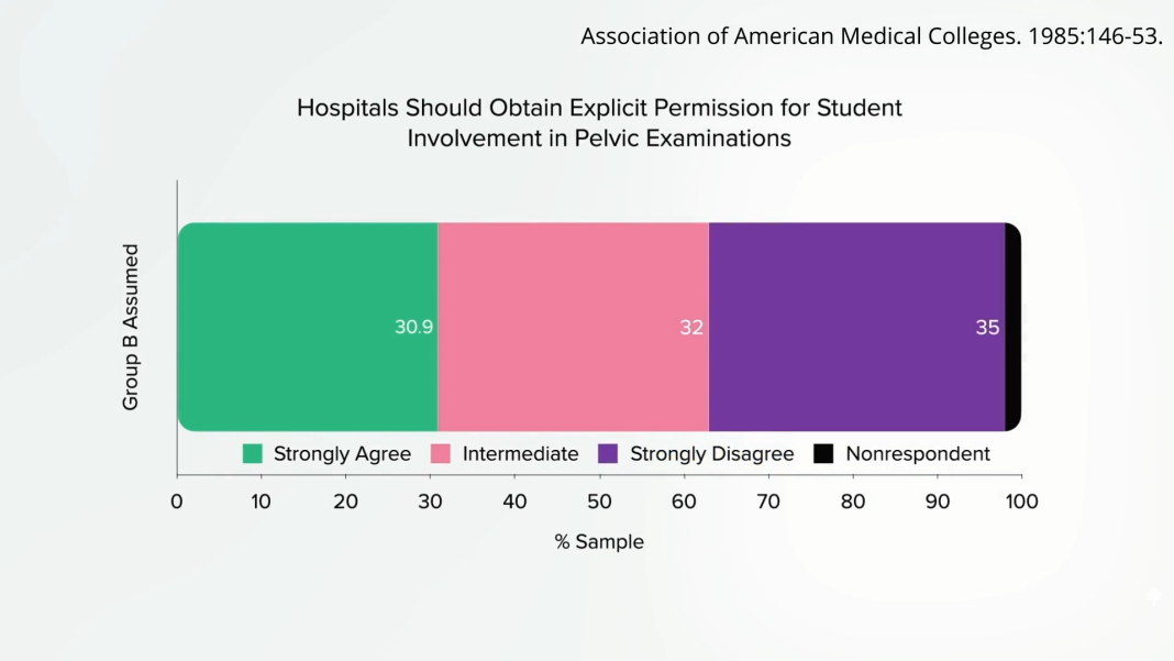 âA survey of medical college students discovered that 100% of them had been launched to sufferers as âphysicianâ by members of the medical workforce,â and, as they undergo coaching, there is, as a journal article is titled, an âErosion in Medical College studentsâ Attitudes About Telling Sufferers They Are College students.â âMoreover, as medical college students full their medical years of coaching, their sense of accountability to tell sufferers that they’re college students is discovered to lower,â particularly if there is a chance to carry out an invasive process. That could be why medical college students appear to develop a âdonât ask, donât informâ coverage in the case of looking for consent for pelvic examinations on anesthetized sufferers. Greater than a 3rd of 1,600 medical college students surveyed throughout the nation strongly disagreed with the assertion âHospitals ought to receive express permission for scholar involvement in pelvic exams,â as seen beneath and at 4:03 of my video Medical College students Follow Pelvic Exams on Anesthetized Ladies With out Their Consent.