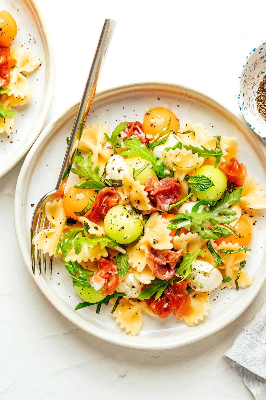 This prosciutto melon pasta salad recipe pairs candy melon, salty prosciutto, recent herbs, and mozzarella with farfalle pasta and a zesty white balsamic French dressing.