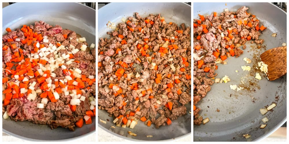 - Add the diced onion and carrots, cook dinner and stir for an additional 8 minutes, or till the meat is browned and the veggies are tender.
