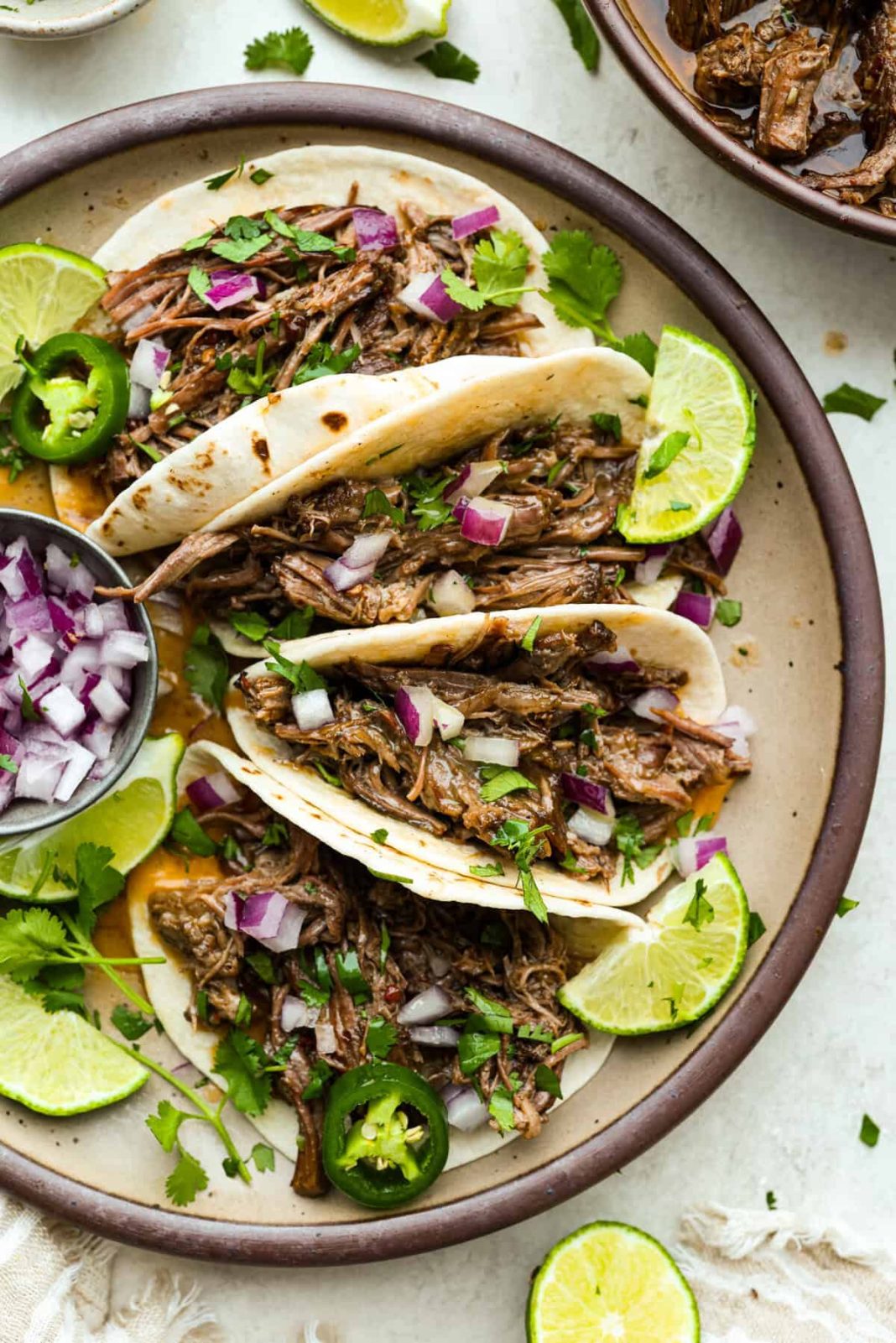 - Prepare dinner and Shred: Cowl with a lid after which prepare dinner on LOW for 8-9 hours or HIGH for six hours. Shred the meat with two forks and serve in a tortilla. Garnish with recent cilantro, chopped purple onion, and lime wedges.