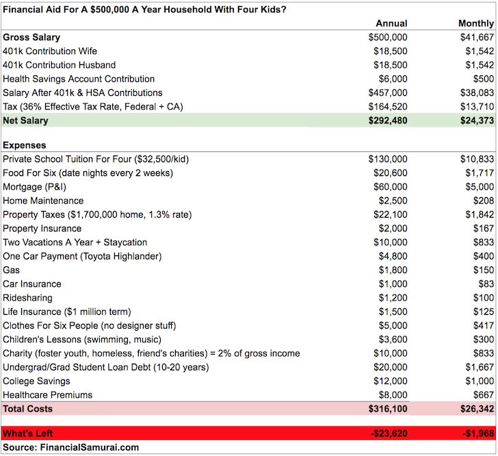 This revelation may appear surprisingâincomes $500,000 per baby and receiving monetary support feels nearly surreal. Nevertheless, it aligns with prior insights Iâve explored, akin to in a put up profiling a household incomes $500,000 however with 4 kids. Their expense profile made them eligible without spending a dime tuition cash, regardless of their excessive earnings.