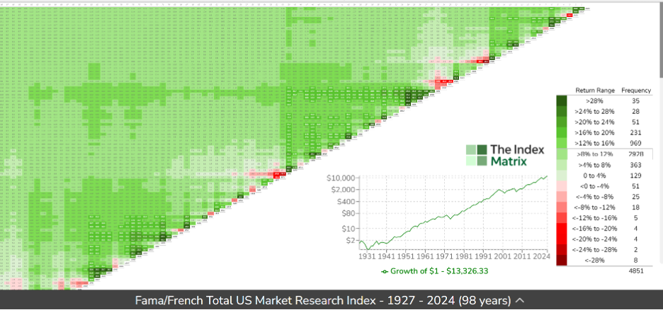 What stands out once you have a look at the graph? There’s a number of inexperienced and bits of crimson. It is a graph of the S&P 500, the main U.S. inventory market index, exhibiting the return for annually, earlier than inflation, from 1927 to 2024. Inexperienced represents optimistic years and crimson, unfavourable years. The deeper the shade, the upper or decrease the return.
